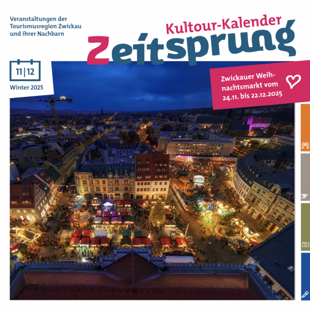Die Tourismusregion Zwickau bietet eine riesige Bandbreite verschiedenster Veranstaltungen an. Egal ob Konzerte, Lesungen, Feste & Märkte, Theateraufführungen oder Ausstellungen, in unserem Veranstaltungskalender finden Sie immer ein passendes Event. Stöbern Sie doch einfach einmal durch den Onlinekalender oder blättern Sie in unserem gedruckten "Zeitsprung-Kultourkalender", den wir alle zwei Monat für Sie auflegen. Unterhaltung und Spaß sind garantiert!