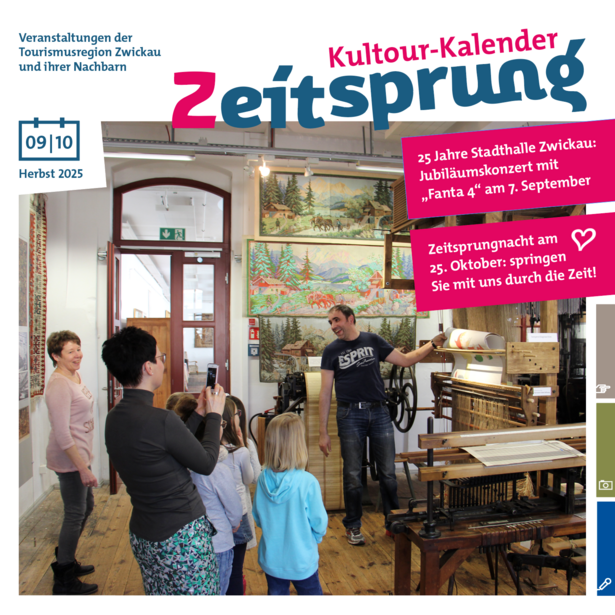 Die Tourismusregion Zwickau bietet eine riesige Bandbreite verschiedenster Veranstaltungen an. Egal ob Konzerte, Lesungen, Feste & Märkte, Theateraufführungen oder Ausstellungen, in unserem Veranstaltungskalender finden Sie immer ein passendes Event. Stöbern Sie doch einfach einmal durch den Onlinekalender oder blättern Sie in unserem gedruckten "Zeitsprung-Kultourkalender", den wir alle zwei Monat für Sie auflegen. Unterhaltung und Spaß sind garantiert!