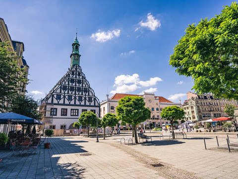 Umgeben von der attraktiven Kulisse des historischen Stadtkerns zeigen sich dem Betrachter ansehnlich restaurierte Gebäude, deren Entstehungszeiten bis ins Mittelalter zurückreichen. Frisch „aufpoliert" zeigt sich der Hauptmarkt seit seiner umfangreichen Renovierung, die im Juni 2000 abgeschlossen wurde. Schon im September gleichen Jahres konnte Zwickau als Gastgeber zum „Tag der Sachsen" das neue Prachtstück als Festplatz einer breiten Öffentlichkeit präsentieren.