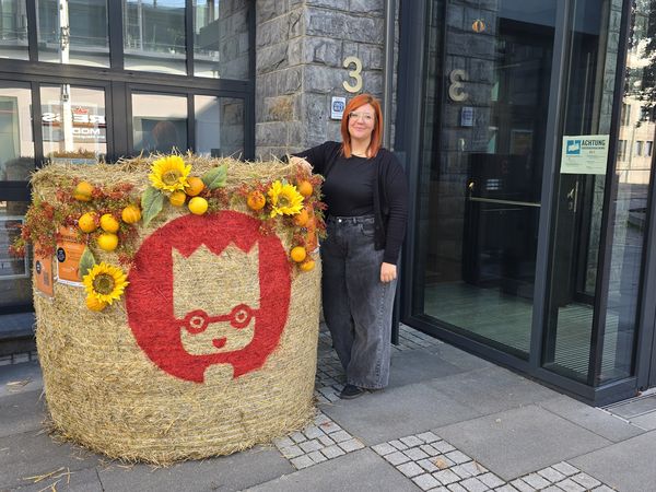 Auch vor dem Theater zeigt sich die Aktion sichtbar: Ein großer Strohballen mit Kürbisdeko und Logo stimmt die Besucher schon von weitem auf die Suche ein.