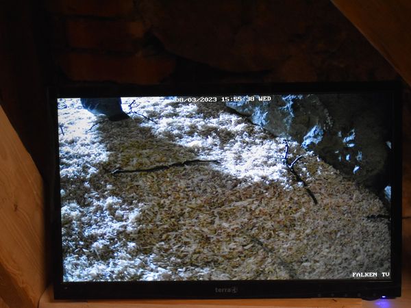 Seit Jahrhunderten brüten Falken und andere Vögel in den Mauern der Burg Schönfels. Nun können die Burgbesucher erstmals das Brut- und Aufzuchtverhalten eines Brutpaares live beim Aufenthalt im Museum Burg Schönfels erleben. Denn vor kurzem wurde eine Kamera in dem Nistkasten in der obersten Fensterscharte des Bergfriedes installiert, die Livebilder auf einen Bildschirm am Turmaufgang überträgt. Die Kamera wurde vor der Balz- und Brutzeit der Vögel an einer Stelle angebracht, wo sie die Tiere nicht belästigt. Damit wurde eine Störung der Vögel verhindert. Mit dem Projekt, das teamintern als „Falken-TV“ bezeichnet wird, sollen die Besucher für die Brut einheimischer Vogelarten in der Region sensibilisiert werden. Ebenso soll anschaulich gemacht werden, dass die Burg auch als Lebensraum für verschiedene Tierarten dient. In den nächsten Wochen wird hoffentlich ein Vogelpaar hier nisten, sodass im Frühjahr die Gäste Livebilder von der Aufzucht der Küken sehen können.