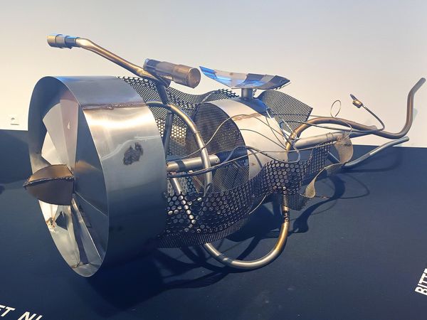 Die zunächst im TRM-HOT, später in einem Glas-Pavillon inmitten der Stadt, gezeigten zwei Skulpturen sind metallene, Motorrädern nachempfundene Schöpfungen der Künstlerin Caroline Mesquita.